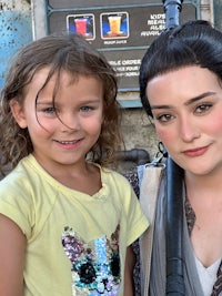 It was almost 6:00 pm, and we were getting hungry. I had been looking forward to themed dining since we started, so the Star Wars “Docking Bay 7: Food and Cargo was a great option. Before we entered, Mika got a chance to meet Rey Skywalker and have a conversation with her. She asked Mika if she would be a pilot, and Mika said she couldn’t drive yet. It was a fun encounter.