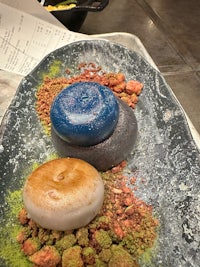 Smoky Braised Beef glazed in Tamarind Sauce. It was served with Stir Fried Mushrooms and Vegetables, Crispy Herb Yucca, Pickled Onions, and Cilantro. It was delicious. Mika went with her regular for this trip Chicken strips called Fried Chicken Tip Yip Youngling Meal. Which was Crispy Chicken served with House-made Macaroni & Cheese and Roasted Vegetables served with a choice of Small Lowfat Milk or Small DASANI® Water. She was courageous and ate it without the sauce. For dessert, we shared Outpost Puffs, which are Chocolate Pastry filled with Guajillo Chocolate Mousse finished with Thai Tea Panna Cotta, Spiced Pineapple, and Confectionary Debris. Mika initially said yuck until I said it was chocolate, and then she tried it and finished them off. For the two of us to eat, it was only about $40.00, which is pretty reasonable at Disneyland prices.
