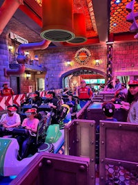 Mario Cart The ride is a four-person per cart ride, but you feel like you are on your own because of the augmented reality visor and lens that you have on your face. The cart does have a restraint, and you get pushed from sis to side often as the ride moves, but even Mika, as small as she is, had a secure seat.
